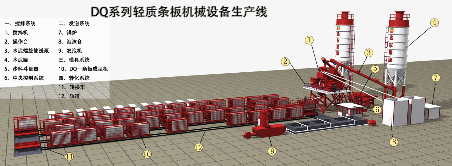 優點:安全、靈活,可自行調節生產板材厚度50-200mm各類厚度板材,產量高、投資比例少、收益大,適合年產五十萬平方以上規模的板材生產